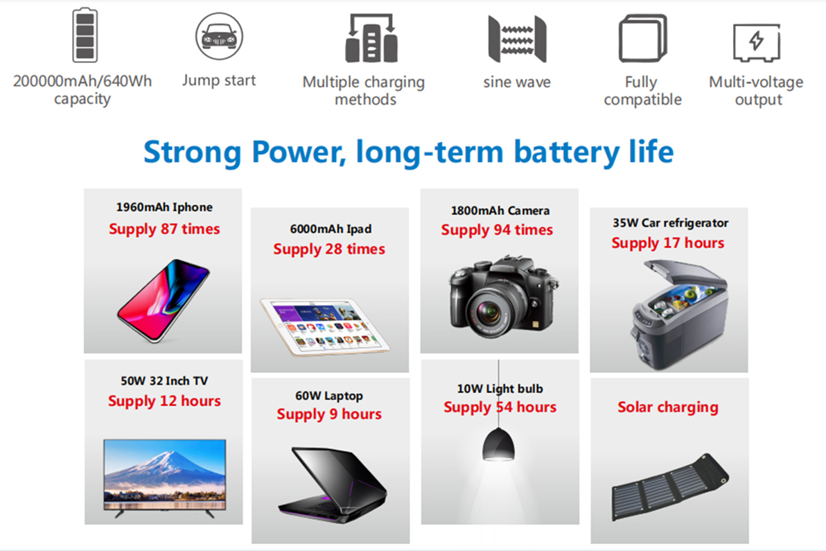 Sterkur kraftur, langtíma líftími rafhlöðunnar, hægt er að hlaða hana með sólarorku og bílhleðslu.